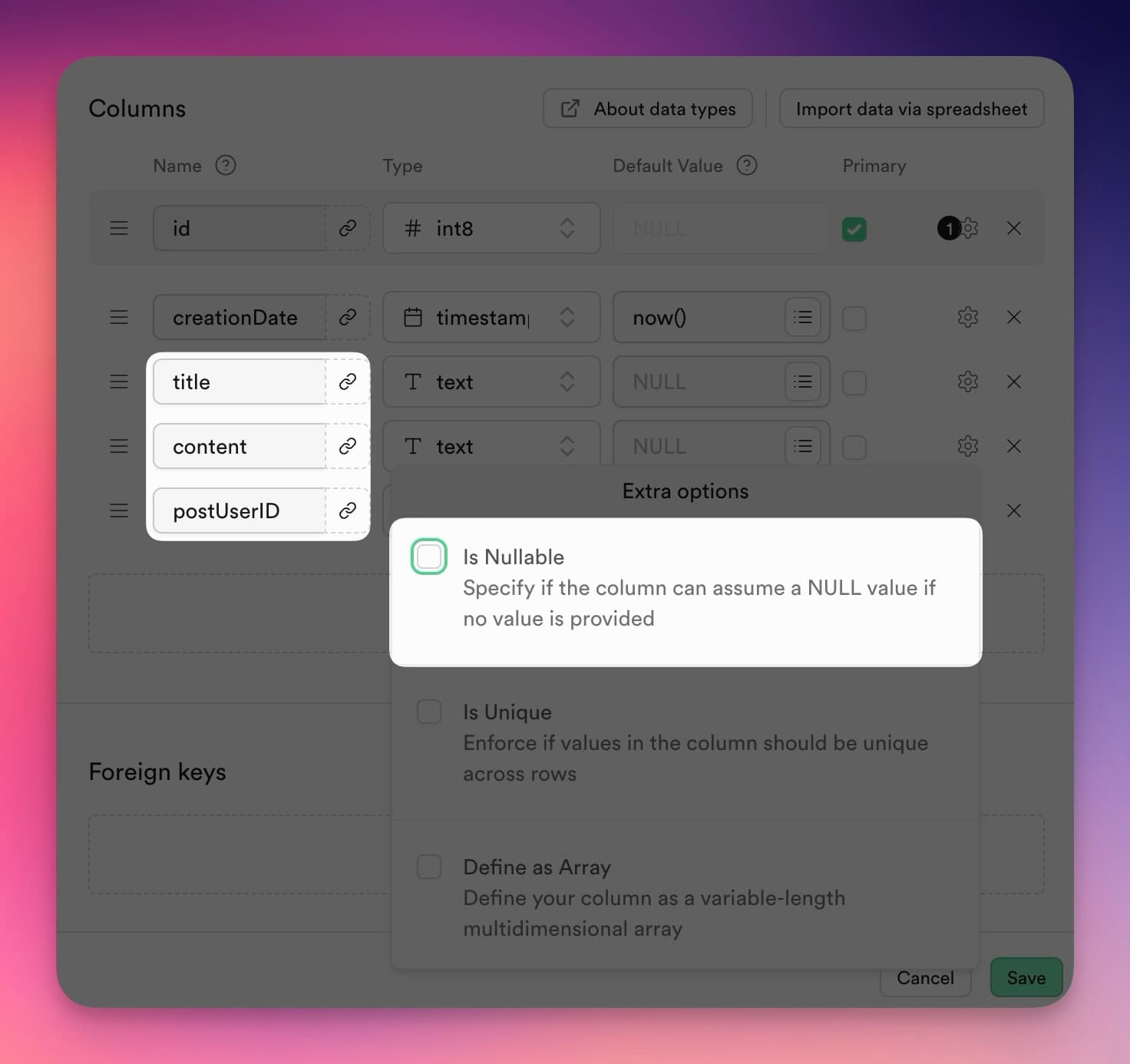 Then, enter all of the columns mentioned above. Make sure that the names and types are correct and that title, content and postUserID are not nullable. (To prevent empty values).